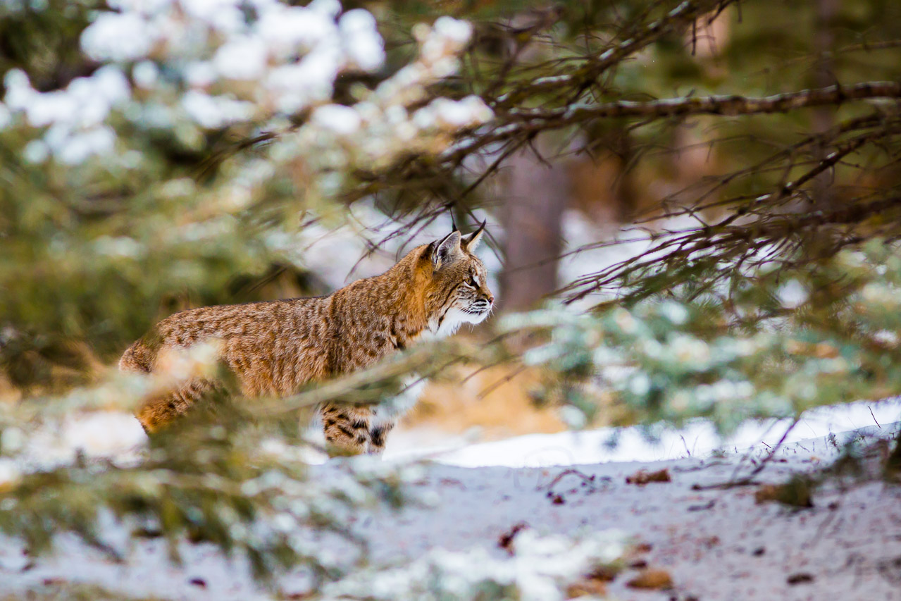 A mother Bobcat stands alertly, watching for her kitten in Redwood Meadows, Alberta