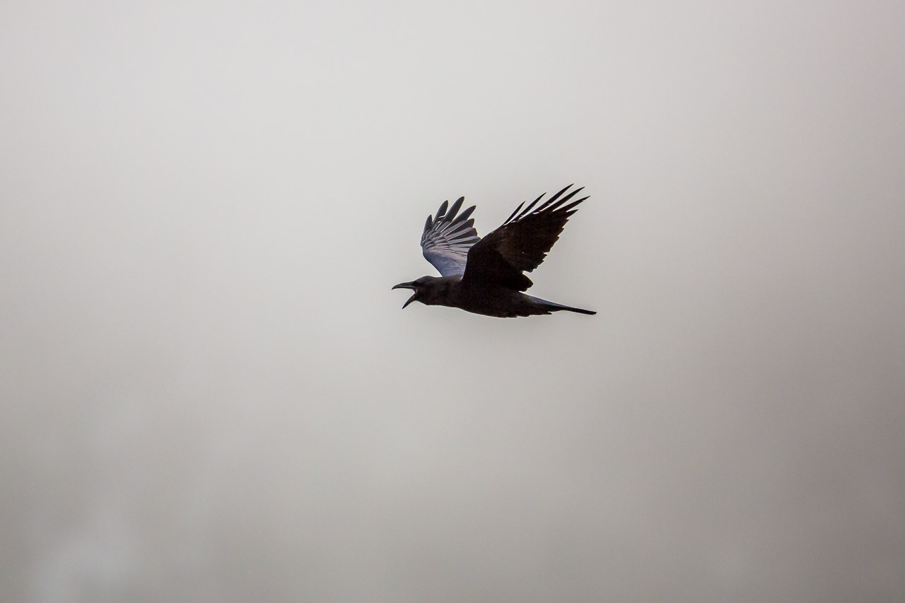 A Crow squacks against the wet, leaden skies in Kanaskis Country, Alberta