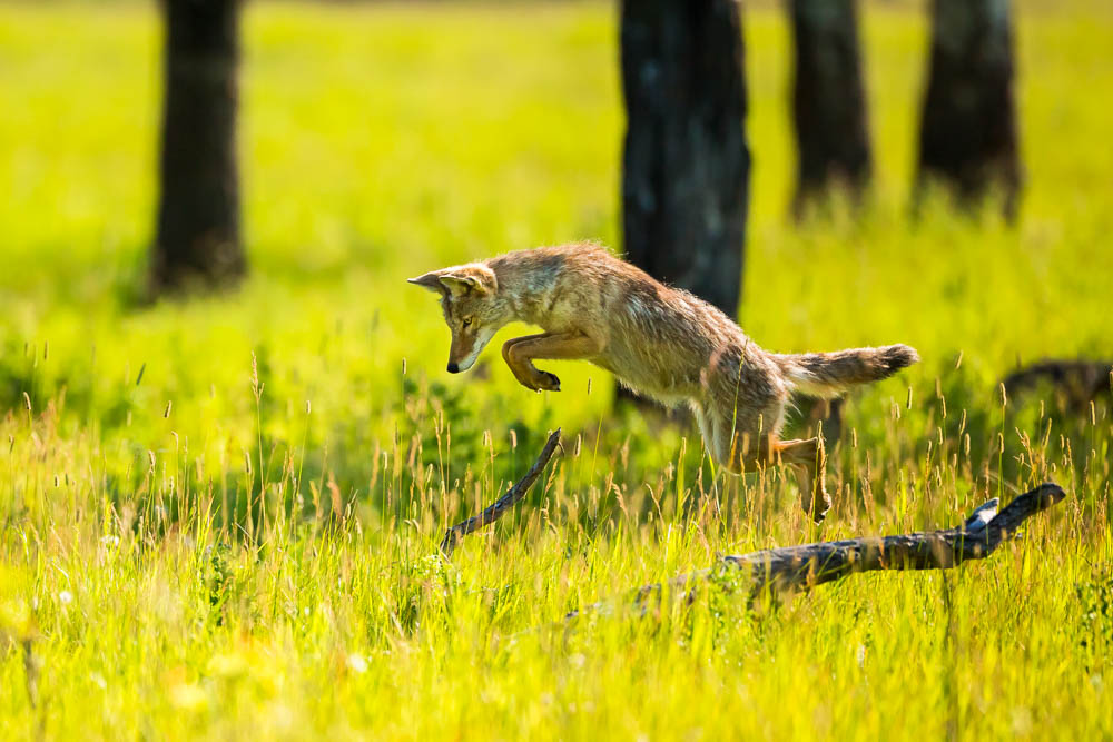 A Coyote leaps while hunting field mice west of Springbank, Alberta