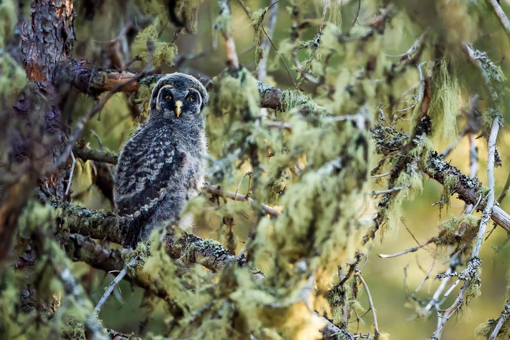 A Great gray owlet stands on a low branch near its nest in Bragg Creek, Alberta
