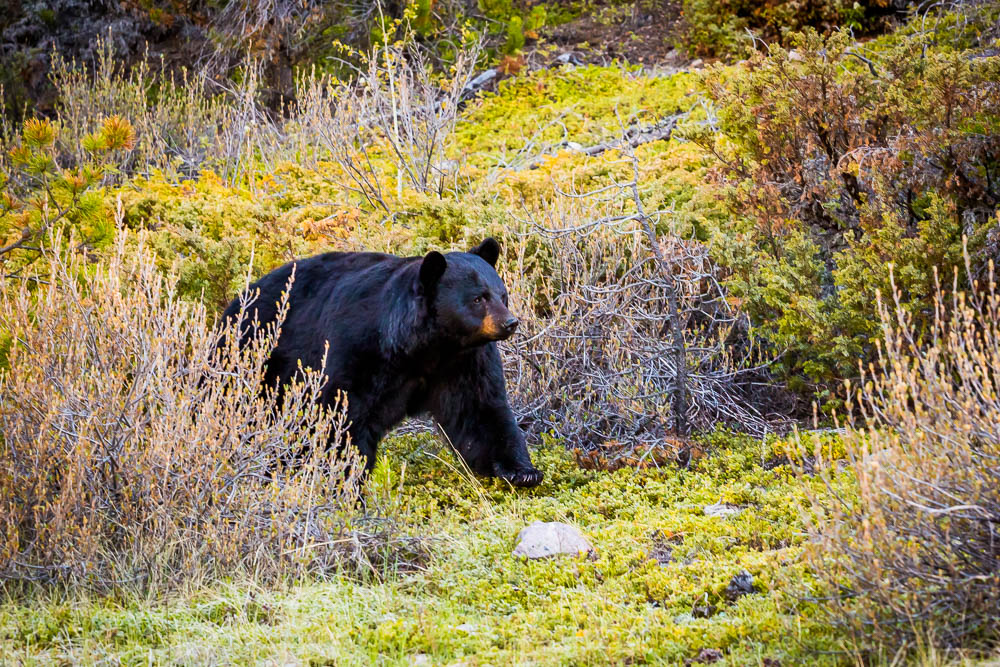 A Black bear strides along a hillside south of Jasper, Alberta