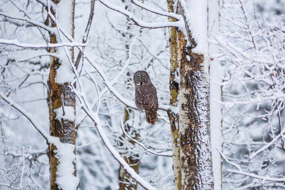 Great gray owl among the trees blanketed by a late spring snowfall in Bragg Creek, Alberta