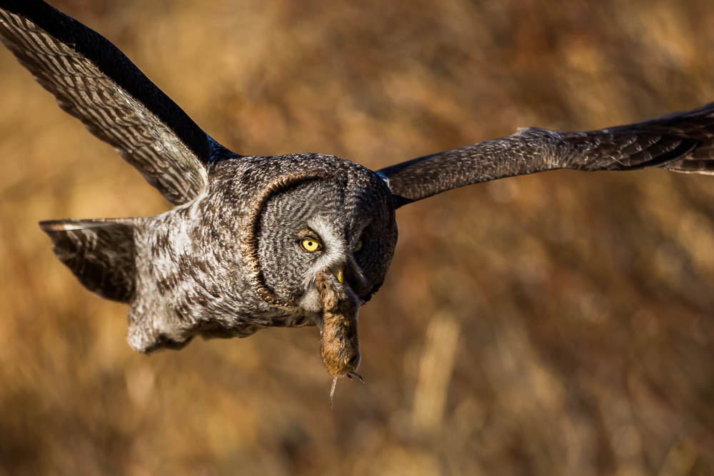 A Great gray owl with breakfast flying in Kananaskis, Alberta