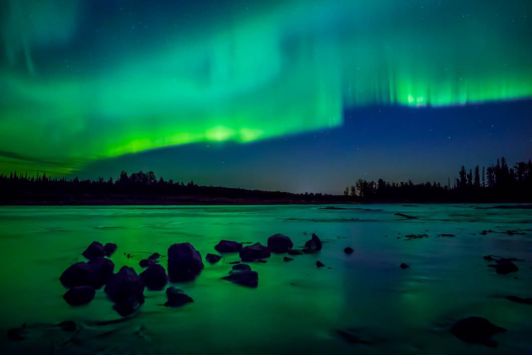 The May aurora display, softened by a long exposure, ribboned above the Elbow River west of Calgary, Alberta.